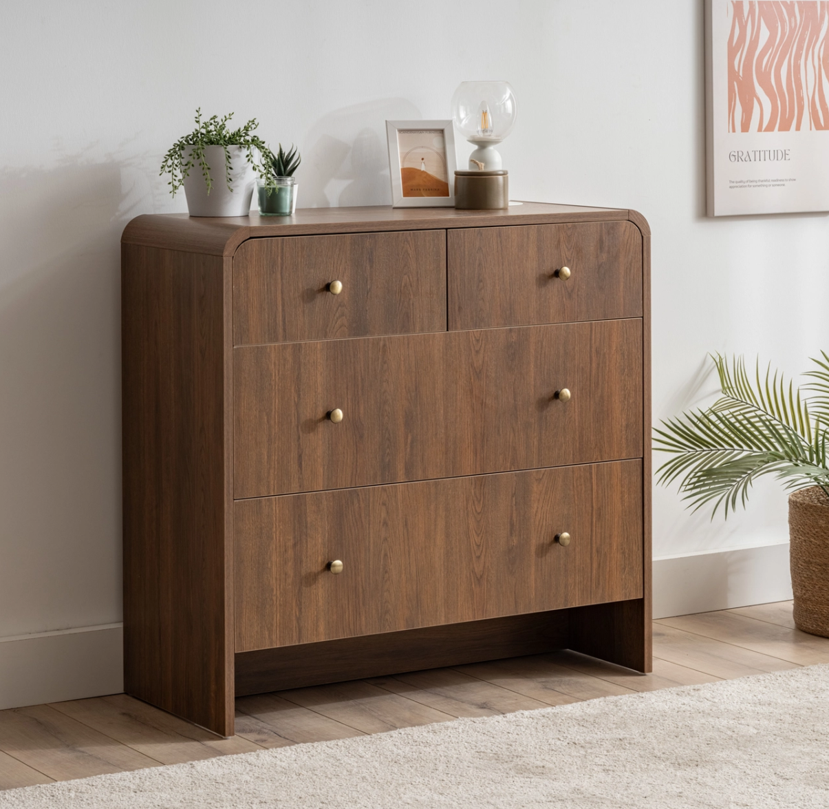 De Girona ladekast combineert een elegante uitstraling met praktische opbergruimte. De zes ruime lades bieden volop plek voor kleding, linnengoed of accessoires, terwijl het afgeronde silhouet en warme houttint zorgen voor een stijlvolle toevoeging aan je interieur. Goudkleurige knopjes geven de kast een verfijnde afwerking. Perfect voor de slaapkamer, hal of woonkamer.