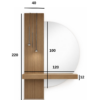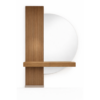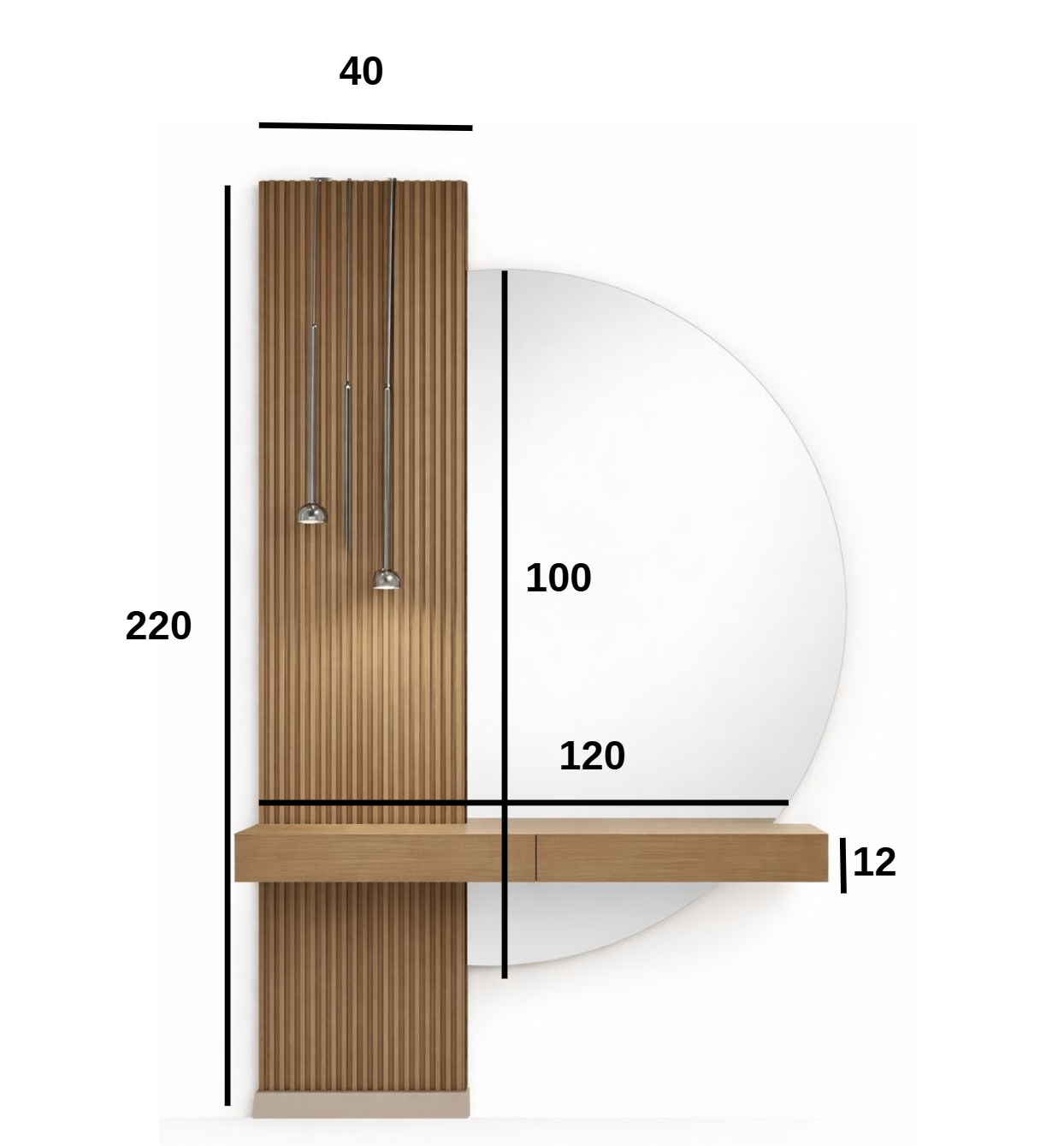 Modern wandmeubel met ronde spiegel, geïntegreerde LED-verlichting, verticale houten latten en een zwevende lade voor een elegante uitstraling. Hanglampen zijn niet inbegrepen; combineer met uw favoriete accessoires of verlichting voor een persoonlijke complete look.